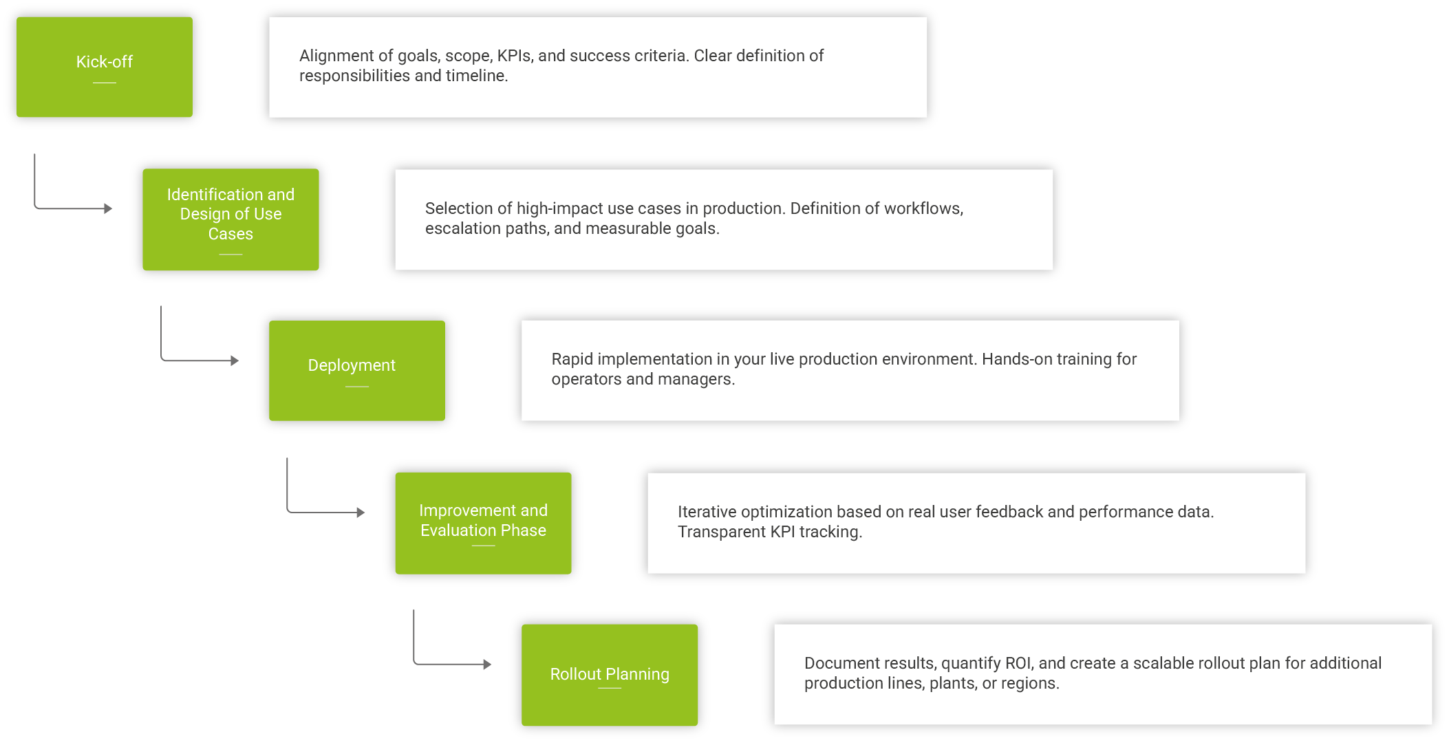 Selection of use cases with high impact in production. Definition of workflows, escalation paths and measurable targets.
