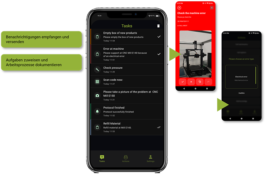 Egal ob auf industriellen Tablets oder handelsüblichen Smartphones, die App fungiert als intelligentes Cockpit. Sie ist nicht nur ein Empfänger für Störmeldungen, sondern ein interaktives Werkzeug, das Wissen genau dann bereitstellt, wenn eine Entscheidung getroffen werden muss. Damit lösen wir das Versprechen von Industrie 4.0 ein: vernetzte Teams, die dank Echtzeit-Daten souverän, eigenverantwortlich und effizient agiert und das komplett unabhängig von spezieller Hardware.
